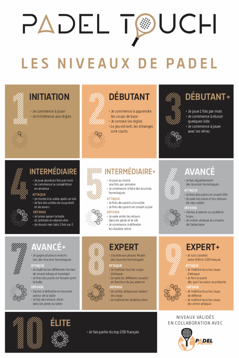 Padel Touch te propose un tableau des différents niveaux de padel.