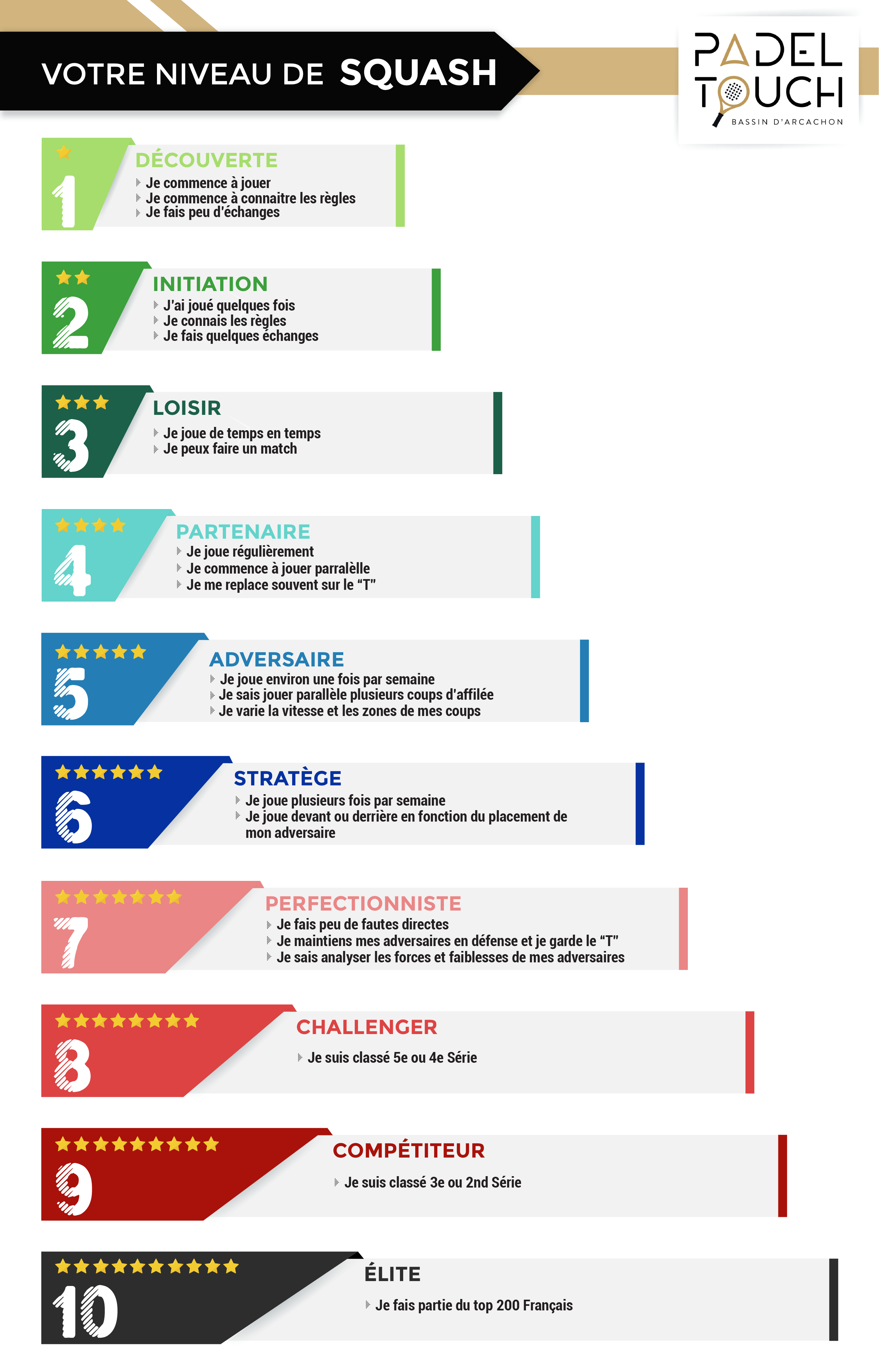 Nous en avons profité pour créer une grille de niveaux pour les joueurs de Squash. Cela vous permettra de créer des parties ouvertes par niveau ainsi que de trouver de nouveaux partenaires.